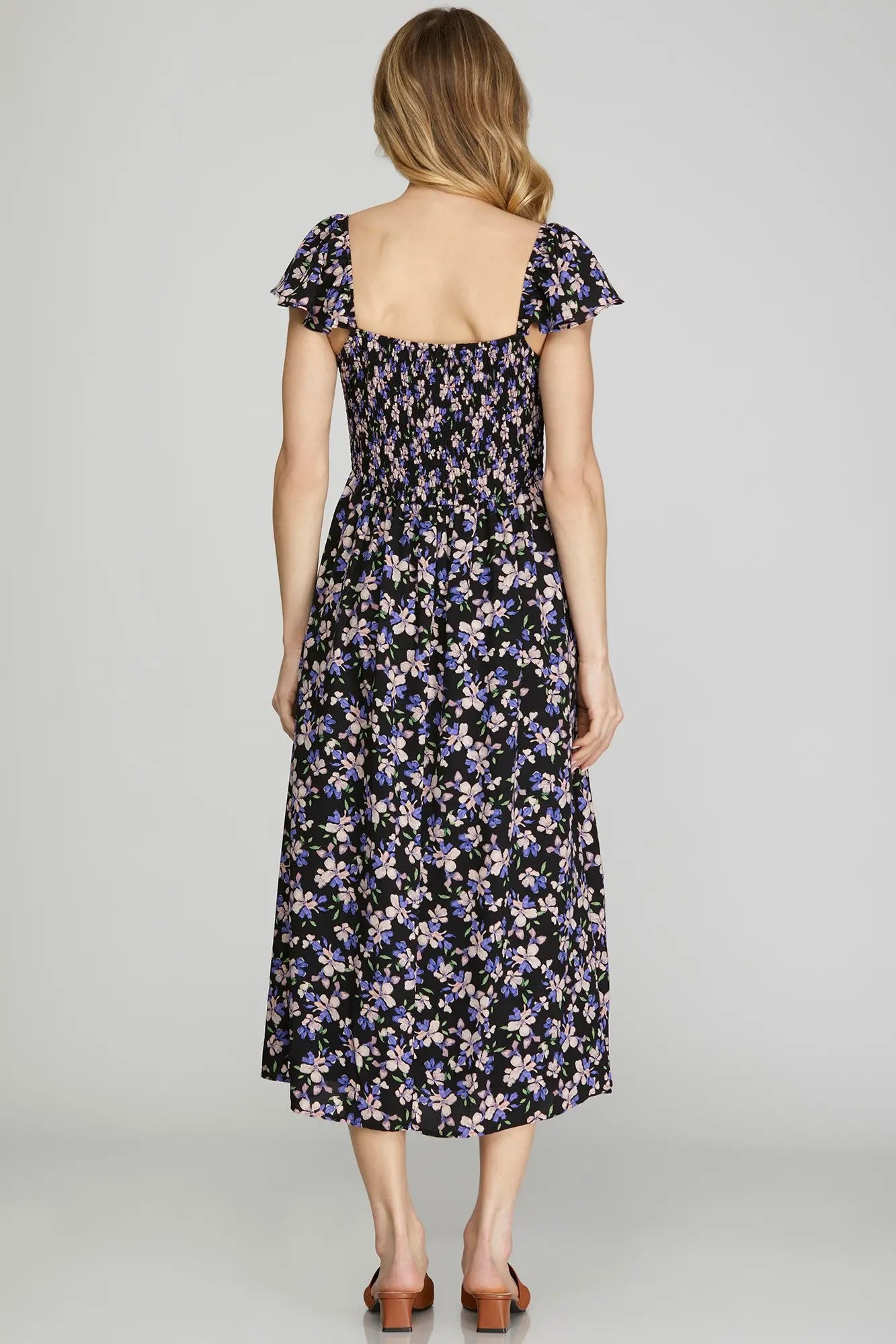 Midnight Bloom Flutter Sleeve Dress