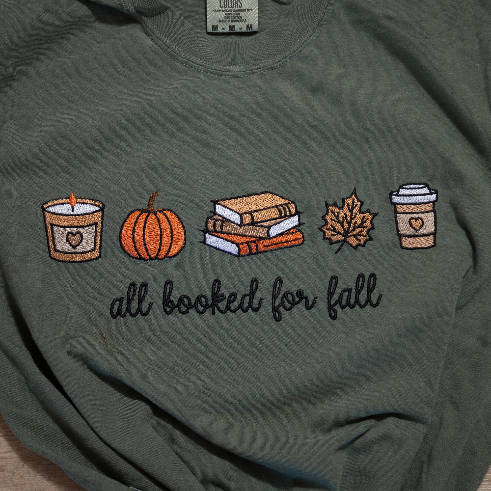 Our All Booked for Fall Embroidered Tee is the coziest nod to your favorite season. Made on a premium Comfort Colors® olive green tee, it features detailed embroidery of fall favorites — a candle, pumpkin, stack of books, autumn leaf, and coffee cups — with the phrase all booked for fall stitched in a playful script.