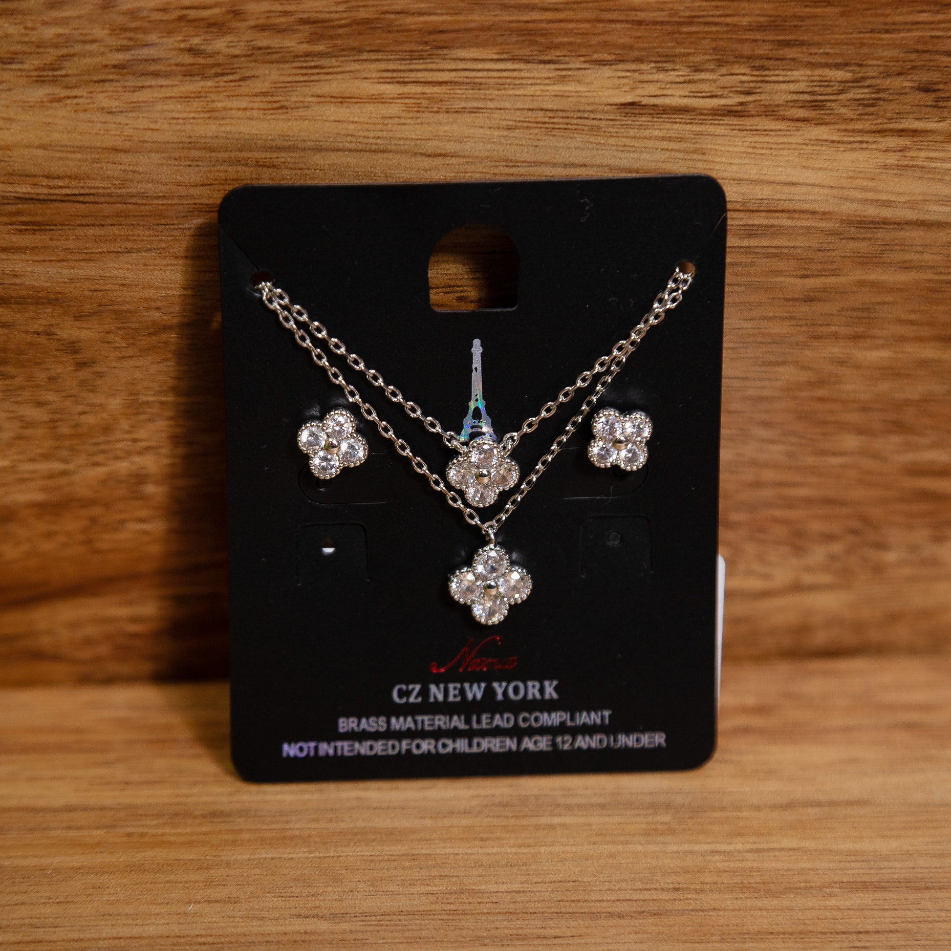 Delicate blooms, dazzling sparkle 🌟. The Blooming Brilliance Jewelry Set combines timeless elegance with everyday wearability. This coordinated duo features a silver-tone necklace with a shimmering four-petal cubic zirconia flower pendant, paired perfectly with matching CZ floral stud earrings.