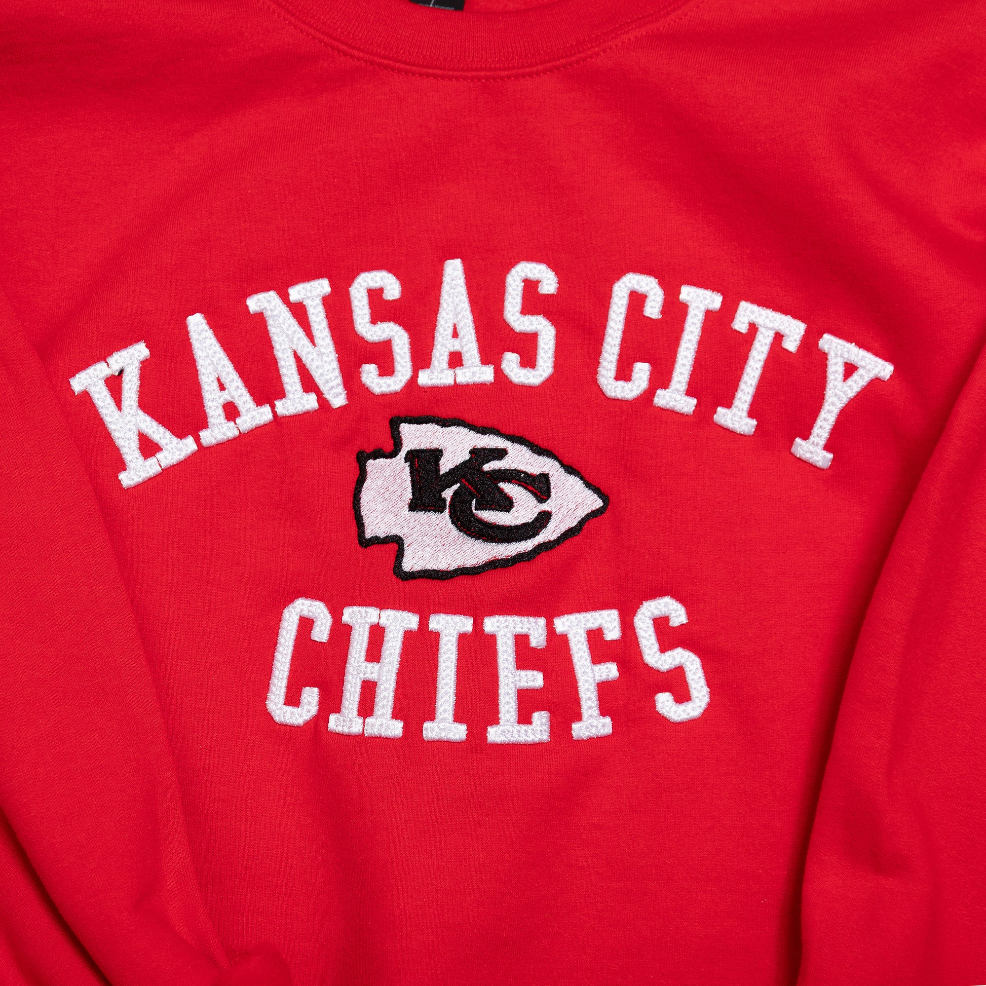 The rich red base paired with raised embroidery gives this piece a timeless, authentic feel — no vinyl, no cracking, just beautiful stitched detail throughout. Cozy enough for game day and polished enough for everyday wear, this is the kind of Chiefs sweatshirt that never goes out of style.