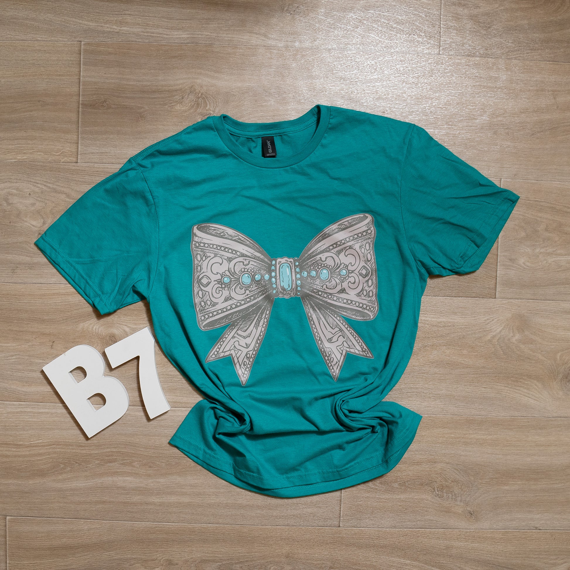✨ Add a touch of western charm to your wardrobe with this Turquoise Concho Bow Graphic Tee. Featuring a large detailed bow design with concho-style accents and turquoise stone details, this tee blends rustic elegance with a bold statement look.