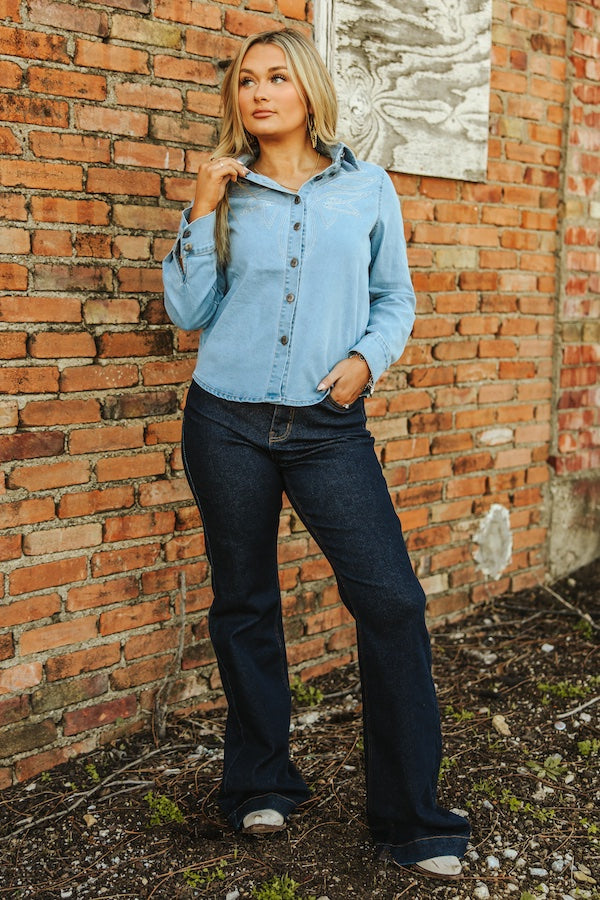 Crafted from a premium stretch denim blend, these jeans offer a flattering mid-rise fit that hugs the hips and elongates the legs. The deep indigo hue adds a polished, versatile touch—perfect for dressing up or down. With classic five-pocket styling, minimal distressing, and a subtle flared leg, this style transitions seamlessly from rodeo to downtown.