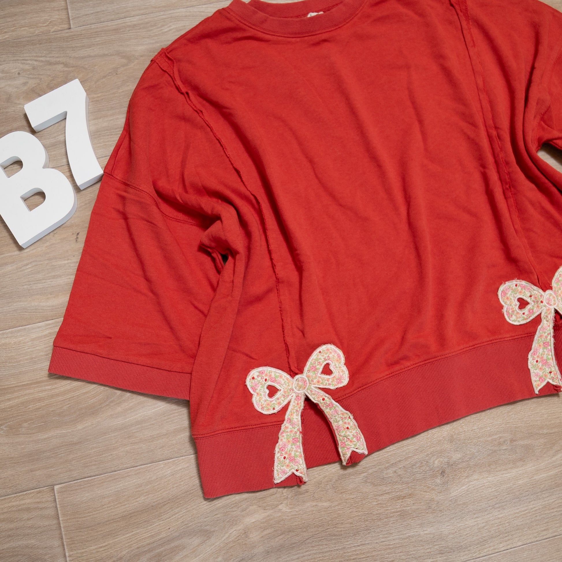 Easel Bow Patch Bottom Hem Mineral Washed Terry Pullover – Oversized Floral Bow Detail Sweater