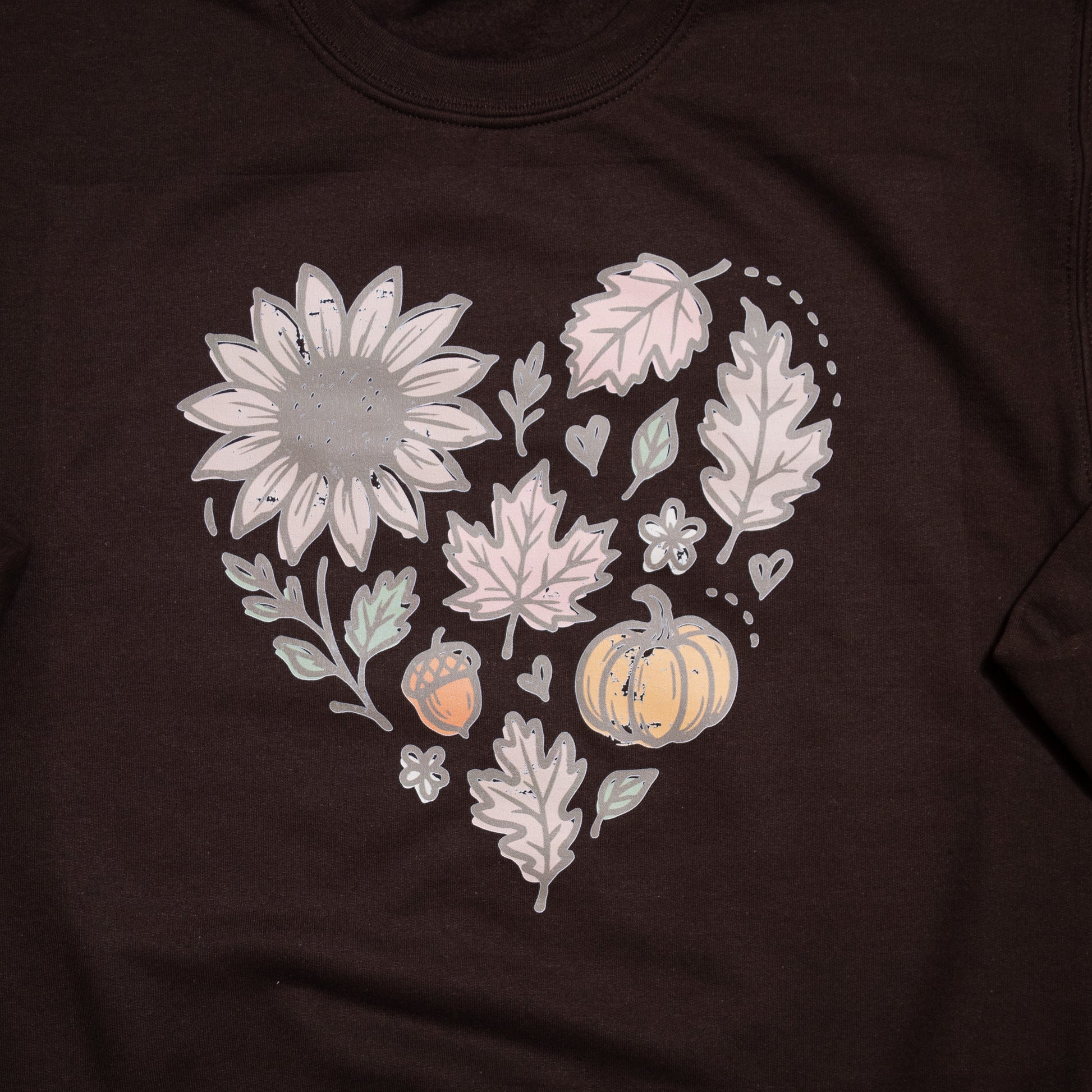 Fall Floral Heart Graphic Crewneck – Cozy Brown Autumn Sweatshirt