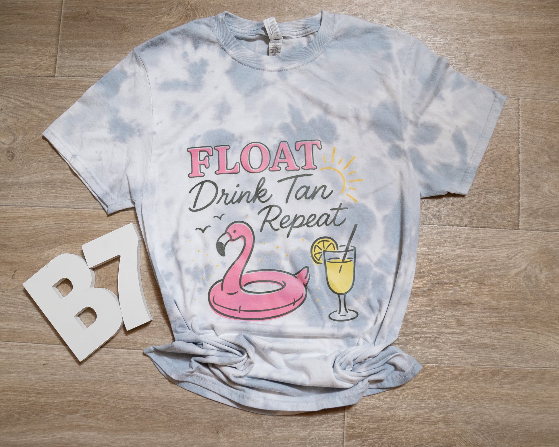 Float Drink Tan Repeat Tee – Summer Pool Flamingo Tie-Dye Graphic Shirt