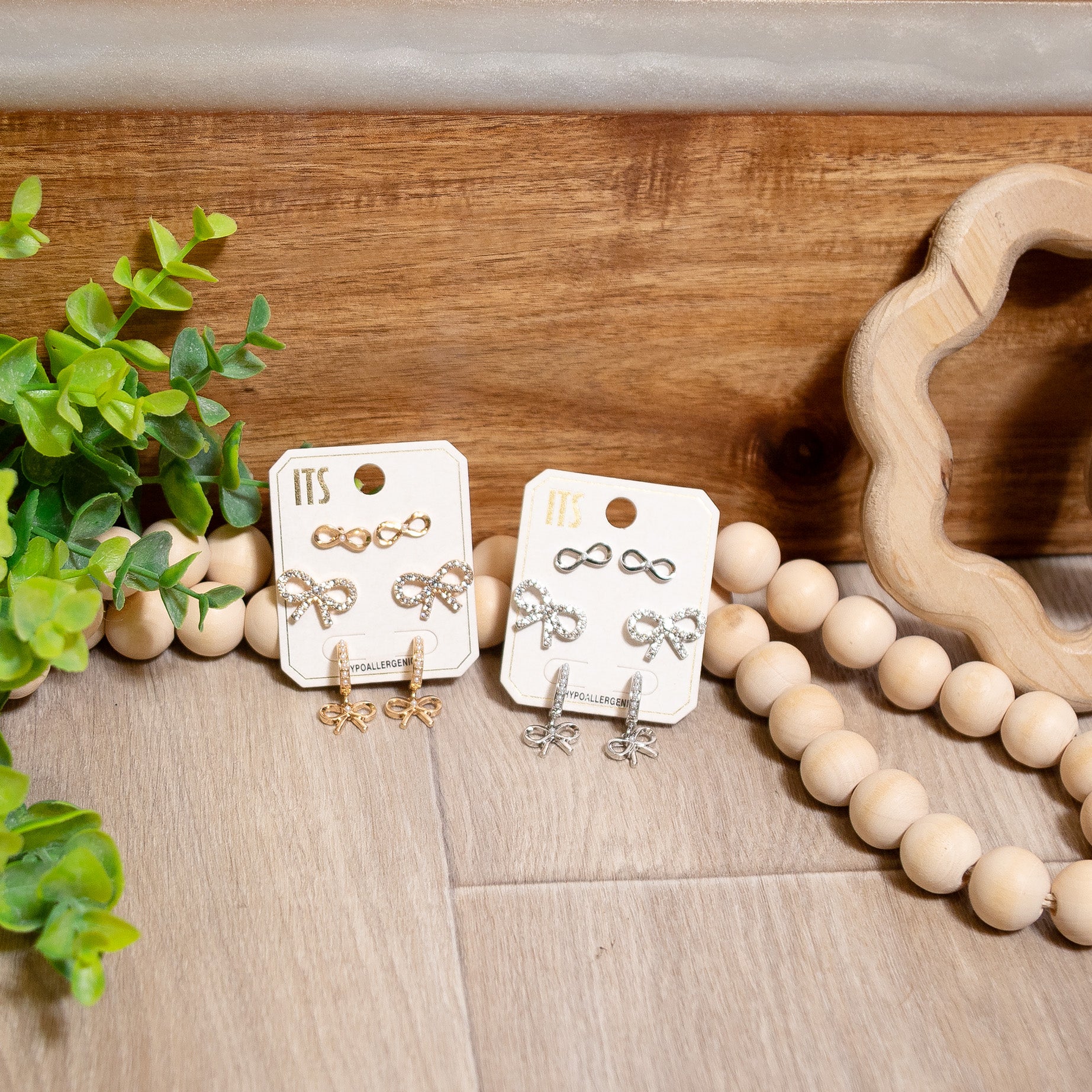 Set of 3 pairs (infinity, bow studs, drop bows)