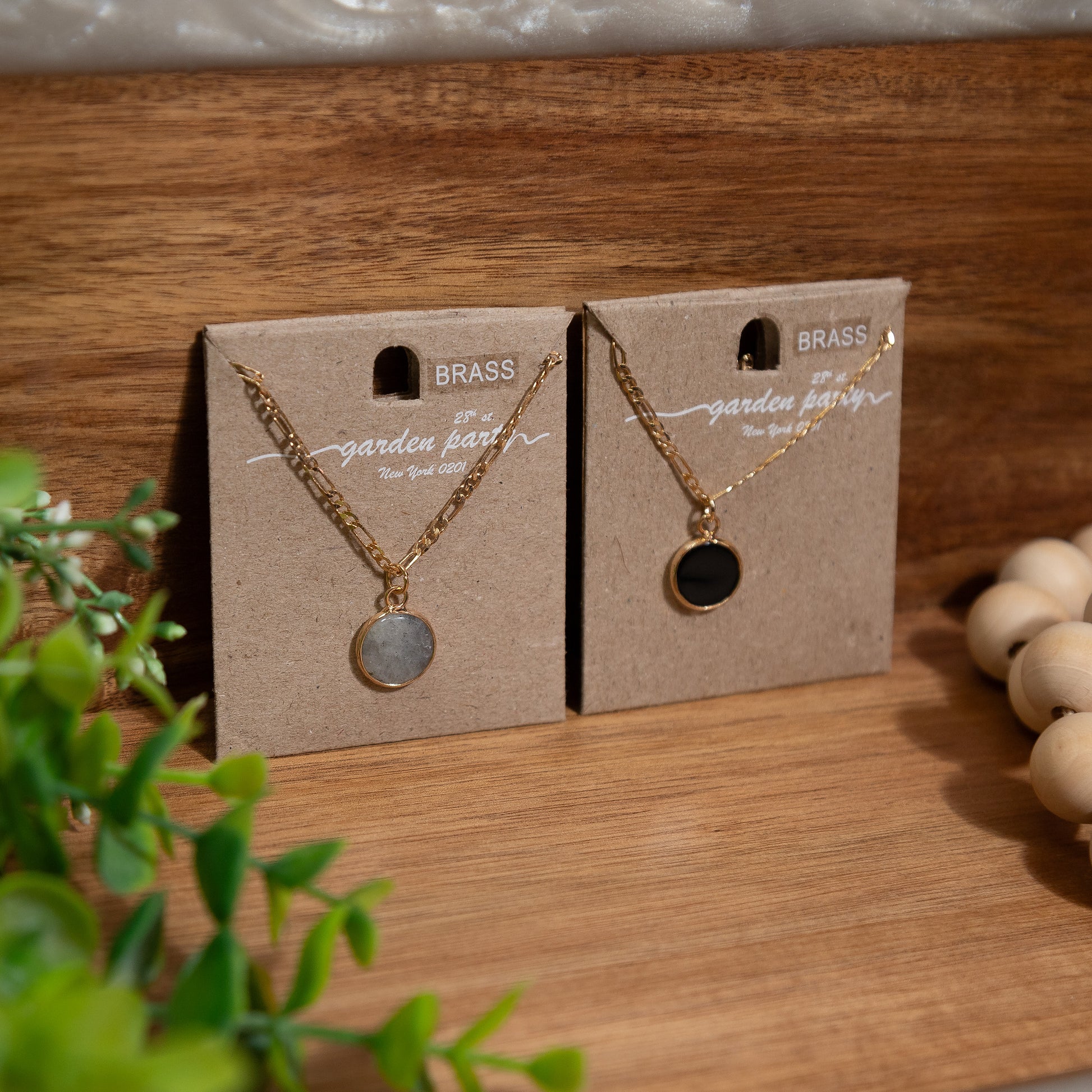 Add a touch of effortless elegance to your look with our Golden Circle Pendant Necklace, available in sleek black onyx or mystical labradorite. Each pendant features a smooth, round stone framed in warm gold-tone brass, suspended from a trendy paperclip-style chain that’s equal parts chic and timeless.