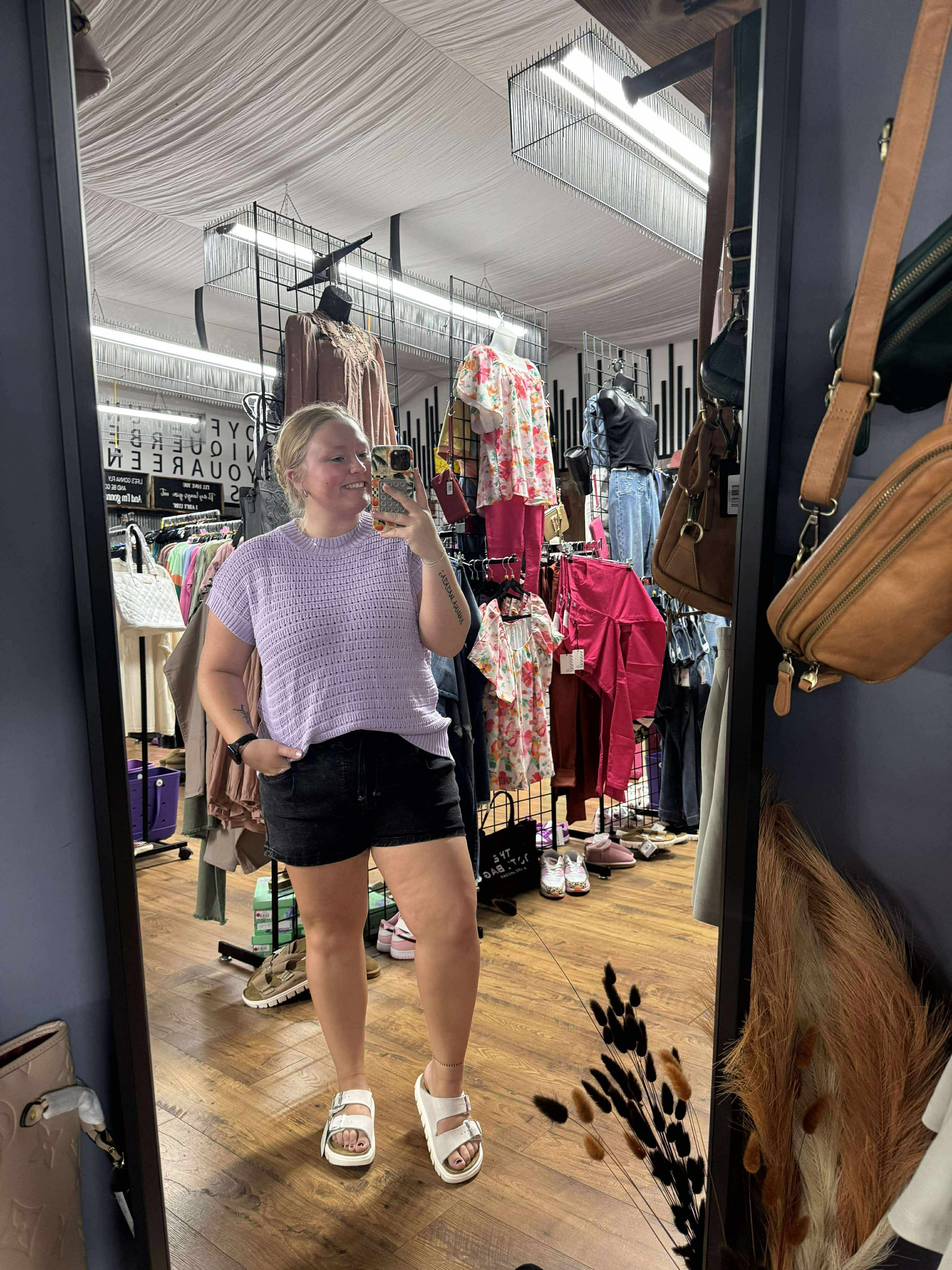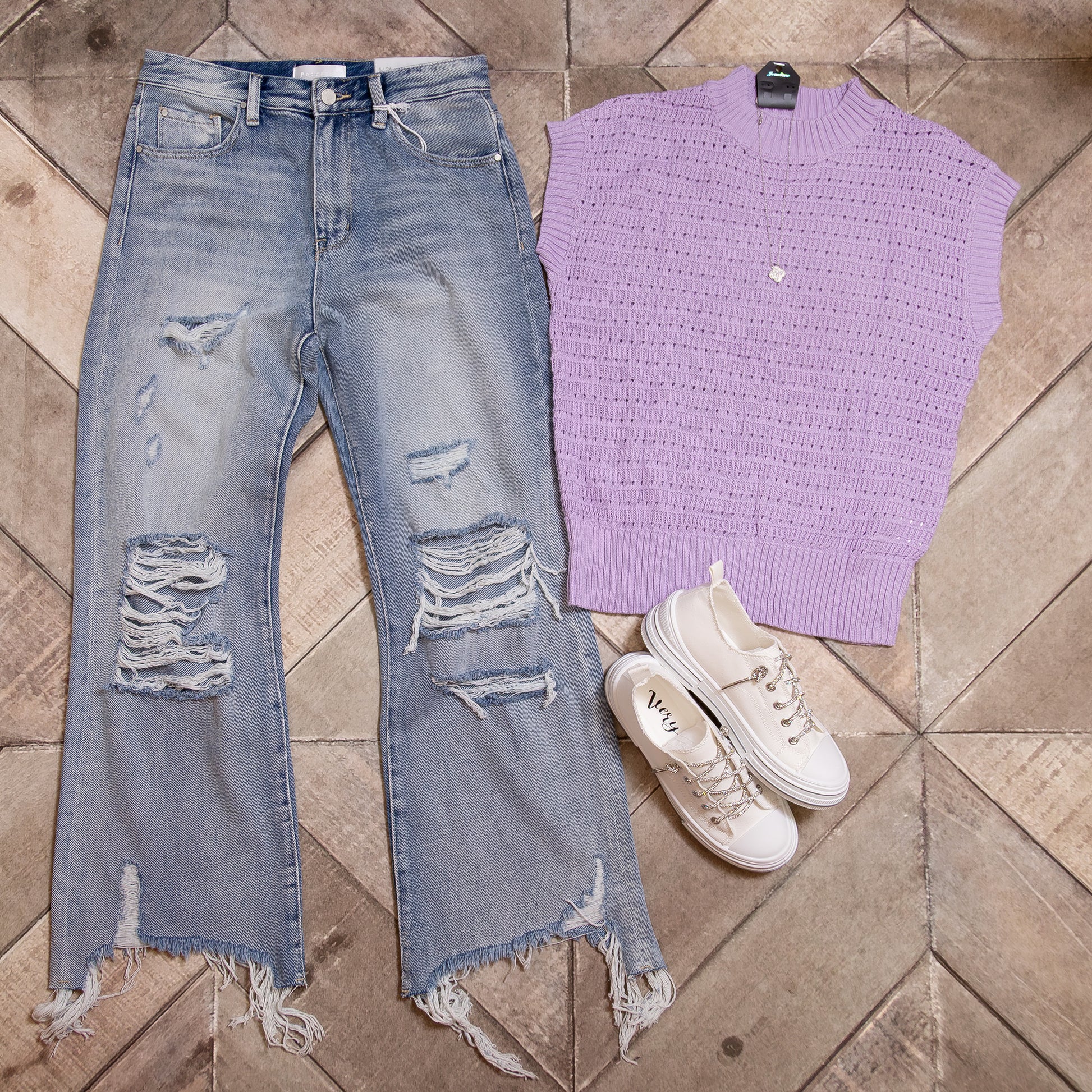 Featuring an intricate pointelle knit pattern, short sleeves, and ribbed trim along the neckline, hem, and cuffs, this lightweight sweater is perfect for warm-weather layering or breezy solo styling. The soft lavender hue adds a fresh pop of pastel that’s easy to dress up or down.