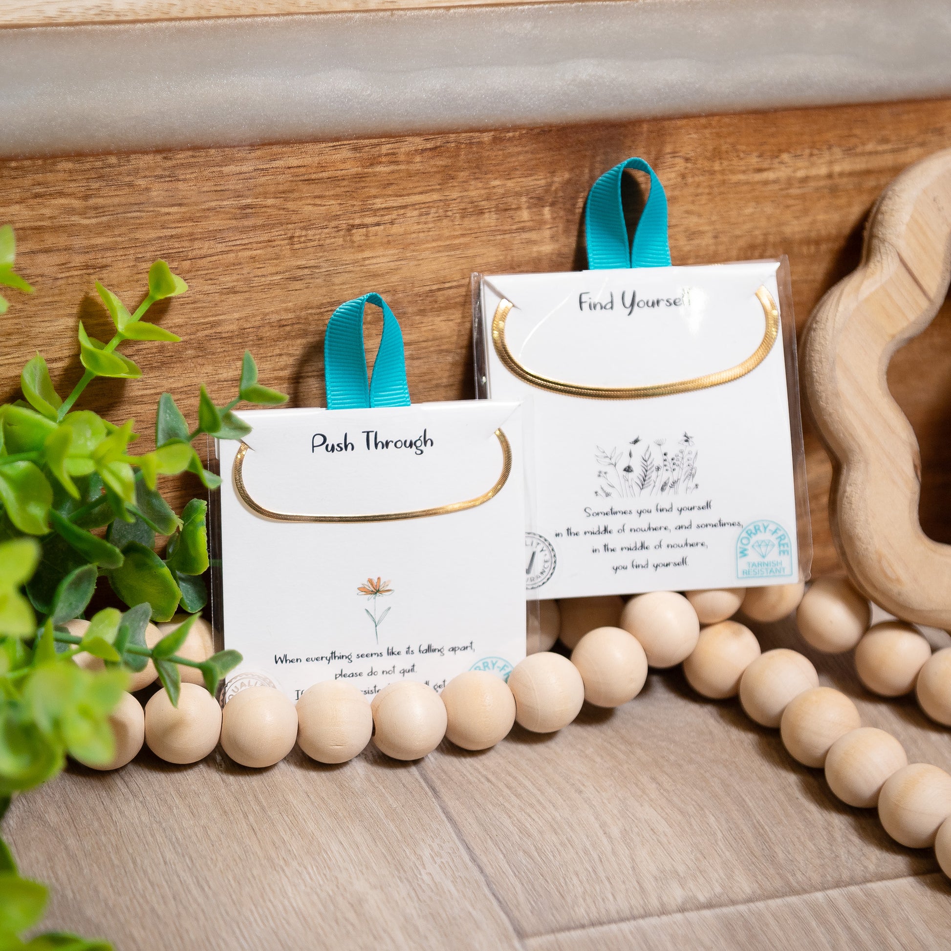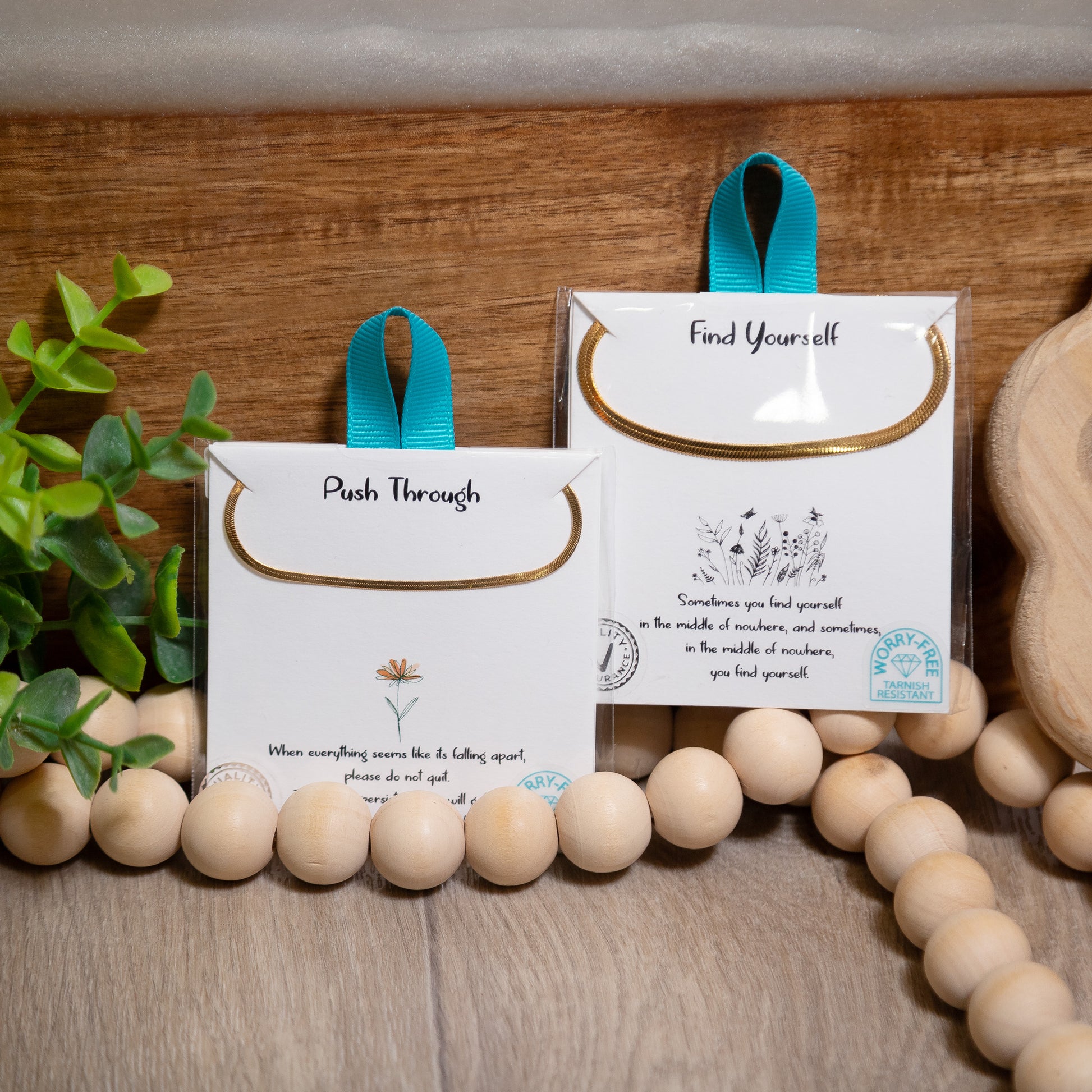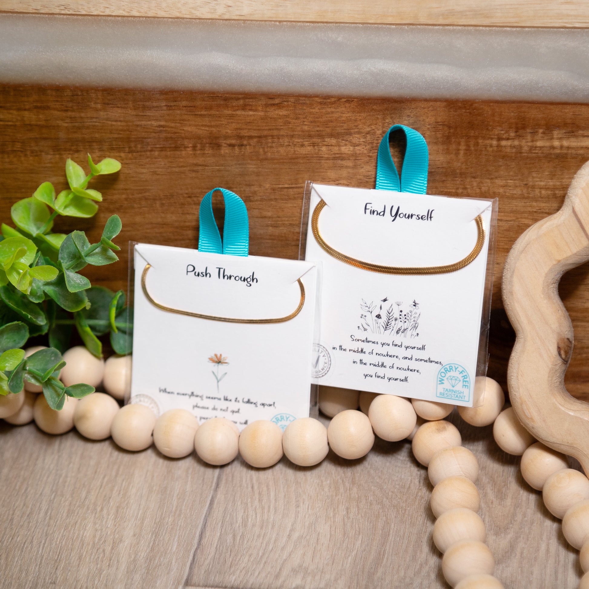 Our Little Reminder Gold Necklace Collection was made to do just that. These dainty gold necklaces come beautifully carded with meaningful messages — a simple, everyday way to carry encouragement close to your heart.