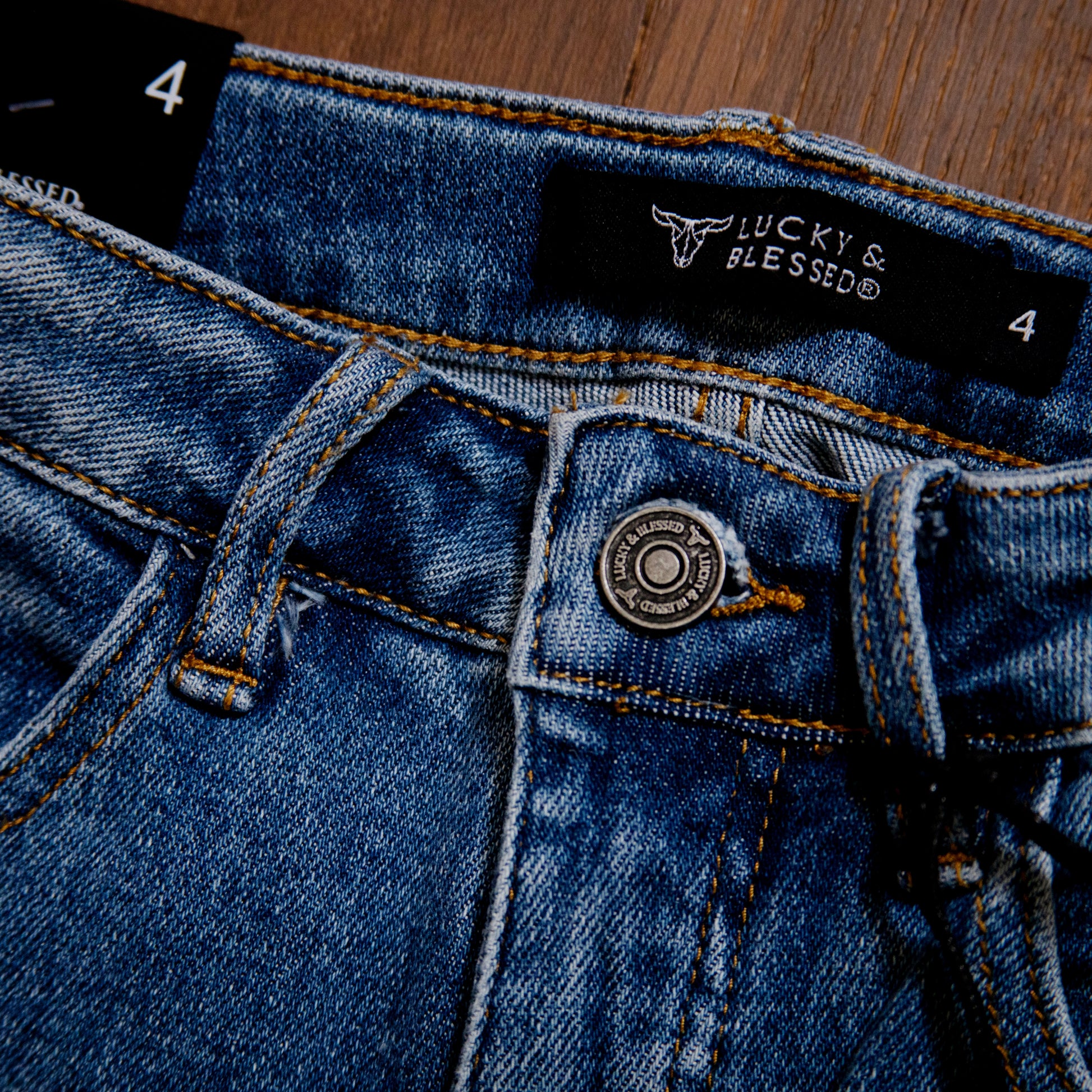 Bring bold attitude and authentic Western edge to your denim collection with these High Rise Medium Wash Distressed Jeans by Lucky & Blessed. Designed for the modern cowgirl who rides with confidence, these statement jeans feature large frayed knee cut-outs and raw hem edges that channel rugged rodeo vibes with a touch of rebellious flair. Crafted from soft yet durable stretch denim, this high-rise silhouette flatters the waistline while providing all-day comfort.
