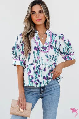 Flirty, feminine, and floral-forward 🌸 Step into spring-ready style with this Purple Floral Ricrac Trim Half Sleeve Peplum Top. Featuring a subtle V-neckline, puffed half sleeves with charming ricrac trim, and a figure-flattering peplum waist, it blends vintage elegance with everyday ease.
