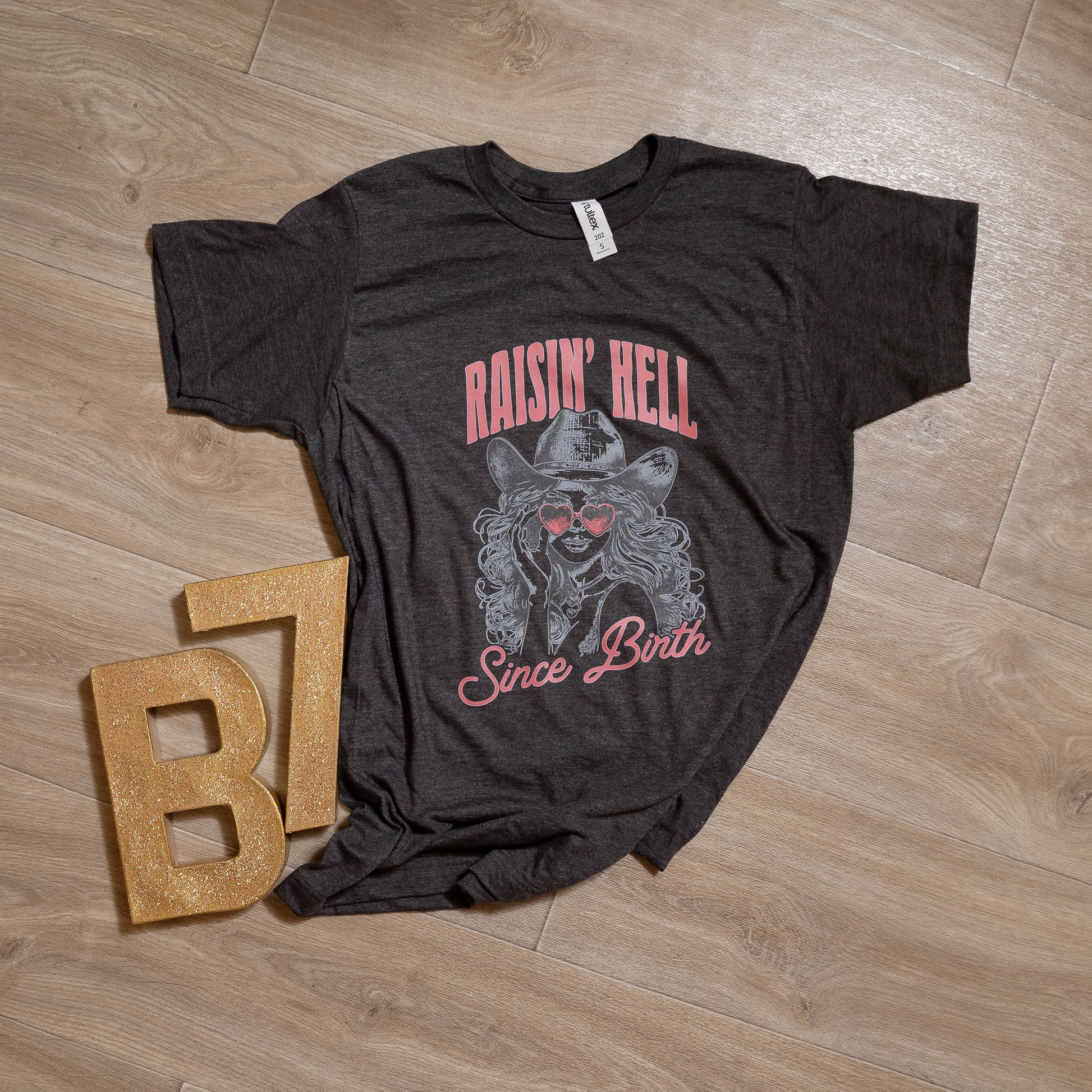 Raisin’ Hell Since Birth Graphic Tee – Western Cowgirl T-Shirt with Heart Sunglasses