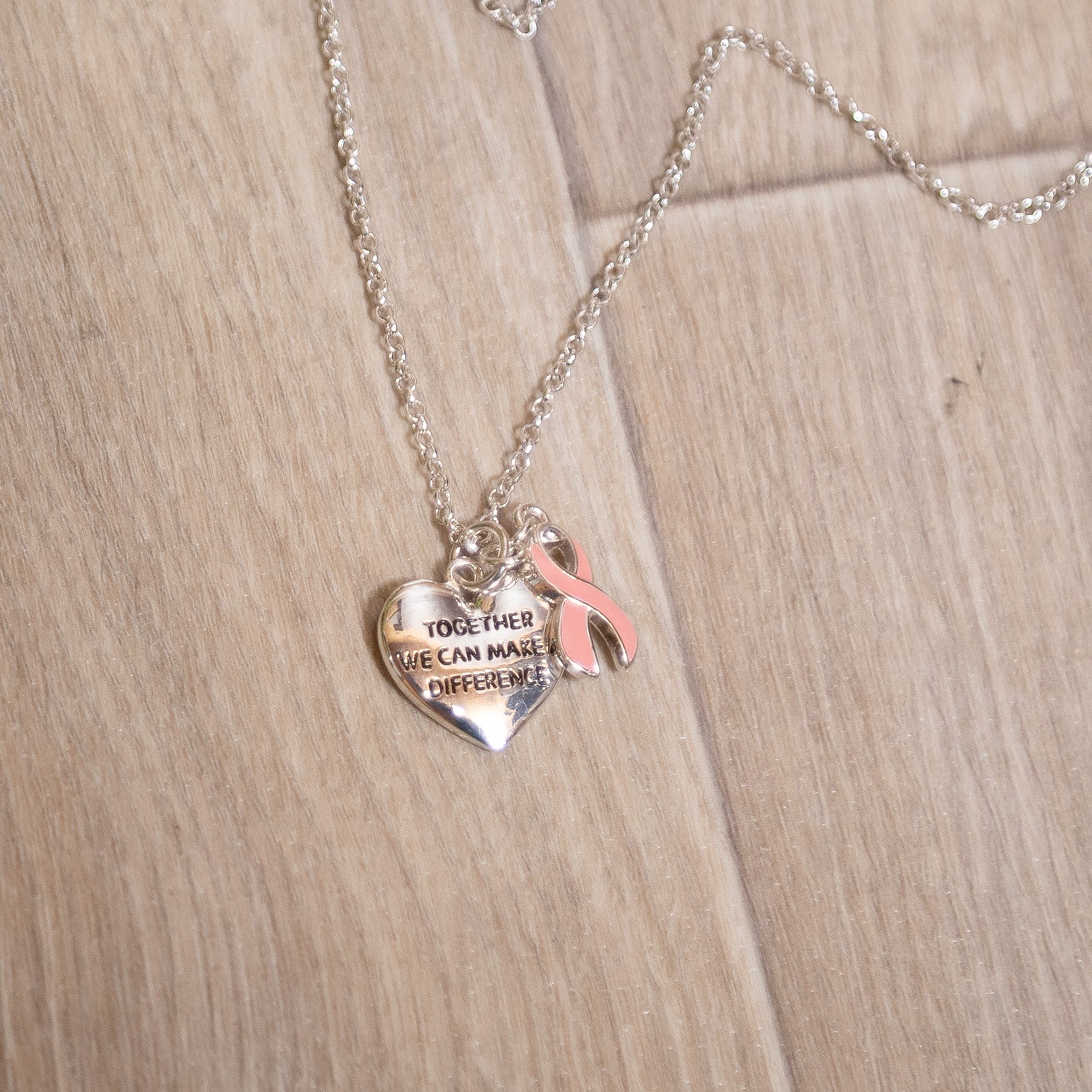 Our Together We Can Make a Difference Necklace is more than just jewelry — it’s a symbol of love, hope, and unity. This silver-tone necklace features a heart charm engraved with “Together We Can Make a Difference” alongside a delicate pink awareness ribbon. It’s the perfect everyday reminder that you’re never alone and that even the smallest acts of kindness can change the world.
