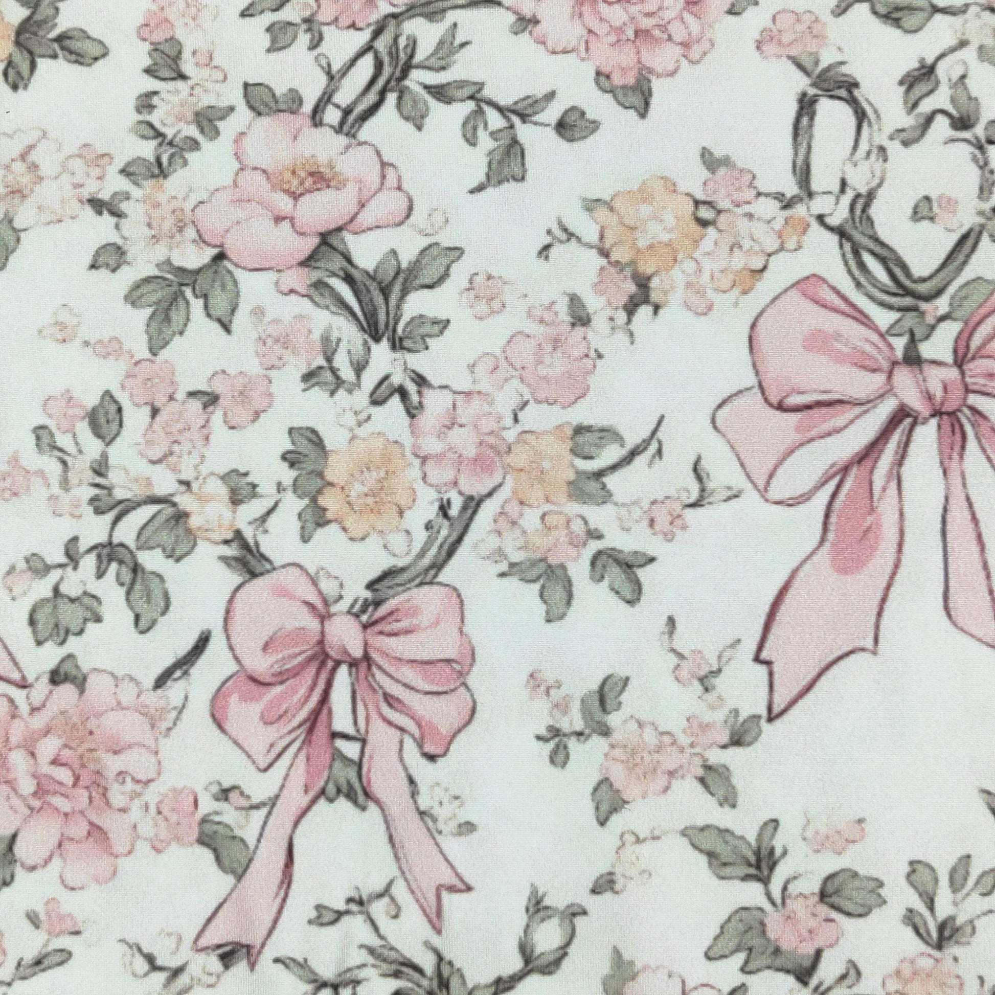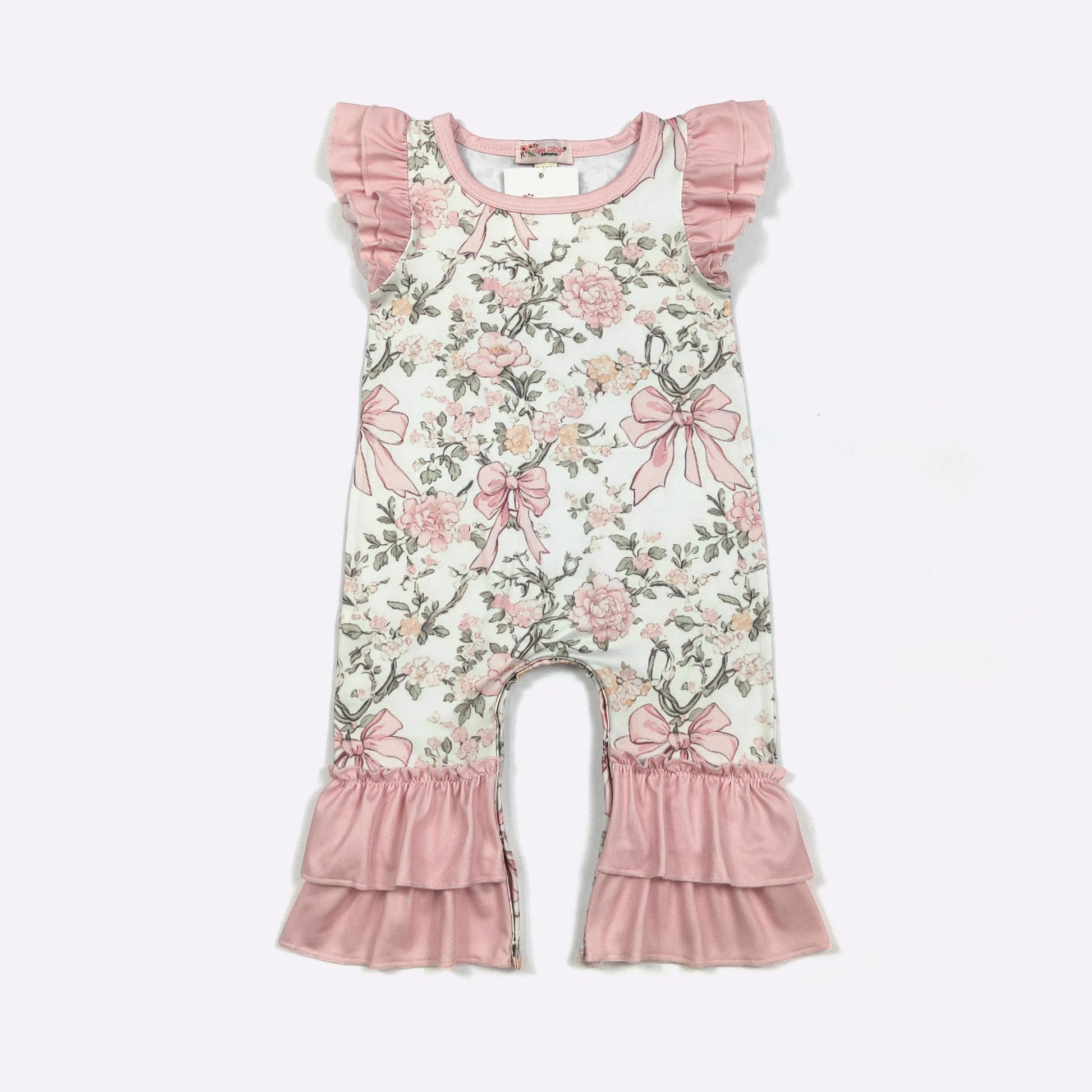 The Wildflower Whimsy Baby Romper by Clover Cottage is the perfect mix of comfort + cuteness, designed for everyday wear while still feeling extra special. Featuring a dreamy floral print with pink bow details, ruffled sleeves, and tiered ruffle legs, this romper is a total heart-stealer.